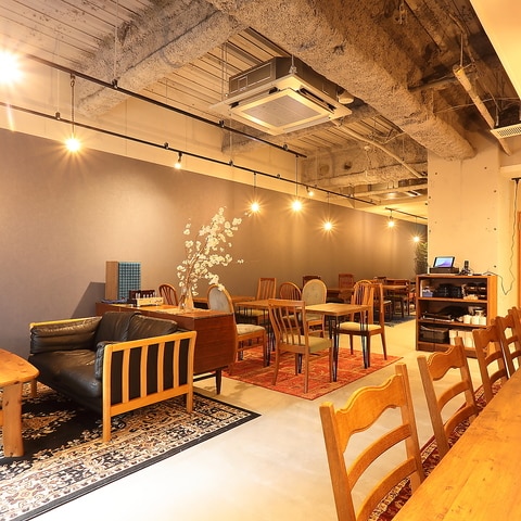 店内は、打ちっぱなしのコンクリートと温かみのあるウッド調のインテリアが調和した、ナチュラルで落ち着いた空間が広がります。アンティーク調の家具やソファが配され、まるで友人の家に招かれたかのようなリラックスした雰囲気を演出。昼は大きな窓から陽光が差し込み、夜は優しい照明が店内を灯します。心地よく流れるジャズの音色に耳を傾けながら、日常を忘れてゆったりとお過ごしいただけます。