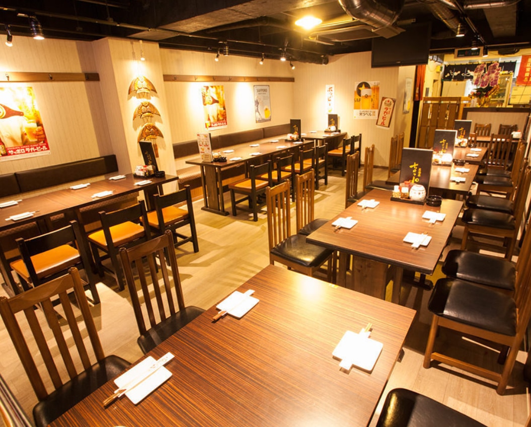 店内は木目調のテーブルや片側ソファ席が並び、間接照明がゆったりとした雰囲気を演出。少人数利用はもちろん、貸切で最大100名規模まで対応可能という、用途の広さも人気のポイントです。