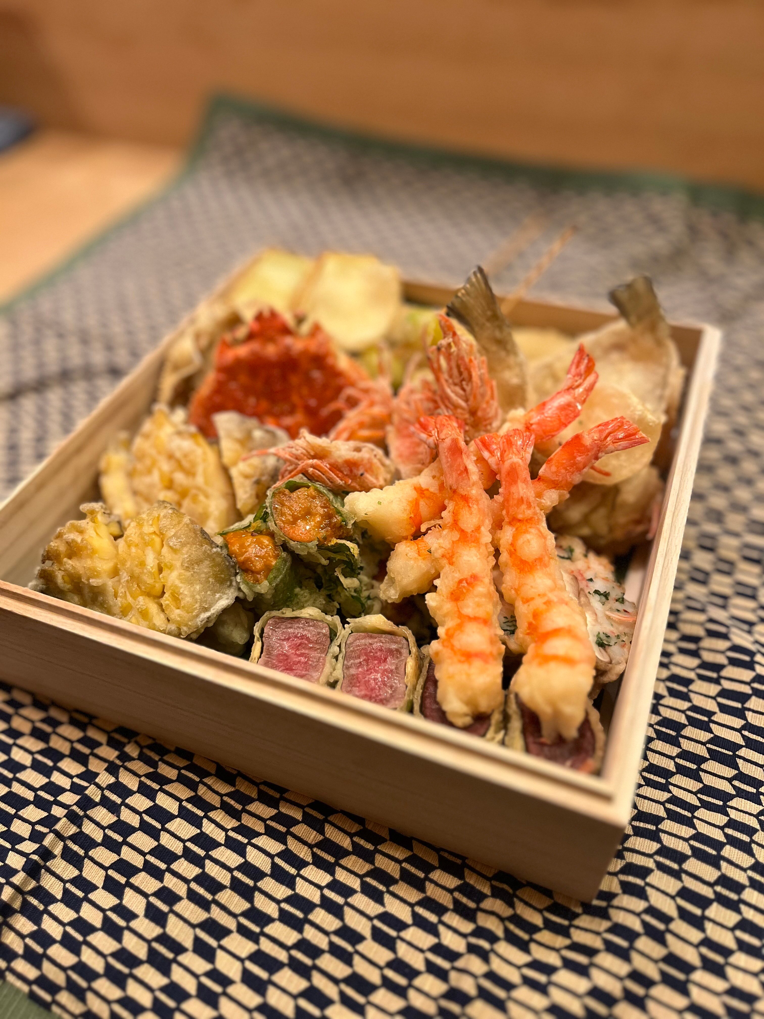 看板は鮑の天ぷら(キャビアのせ)をはじめ、ウニや和牛ヒレの天ぷら、蟹など高級食材を使った天ぷら。天ぷら懐石ではお刺身やサラダも織り交ぜた構成になります。素材は旬と産地にこだわり、揚げ油や温度管理など伝統的技術を堅持しつつ、繊細な味付けを加えています。