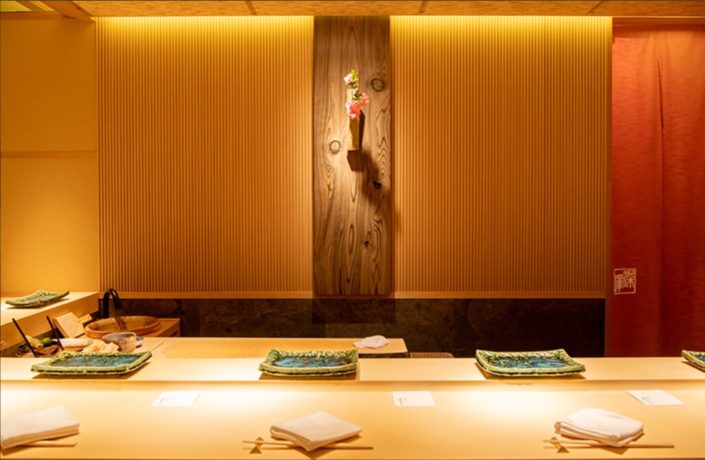 店内はカウンターのみのこぢんまりとした造りで、席数は8席(完全予約制)。木の温もりを生かした上品な空間が印象的です。凛とした佇まいの中で職人の所作を間近に楽しめ、落ち着いた雰囲気は接待や記念日、特別な日の会食に最適です。