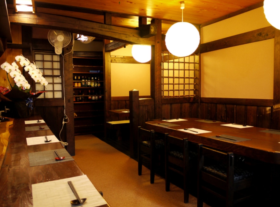 1階の落ち着いた店内はカウンター席とテーブル席あわせて約22席ほど。和の趣を残しつつアットホームな雰囲気で、一人客から少人数の食事、15名〜22名程度の宴会貸切まで対応可能。駐車場を用意しており、観光でのグループ利用や地元での宴席にも使いやすい設えです。ランチ利用や仕事帰りの一杯、接待や記念日など多様なシーンに適しています。
