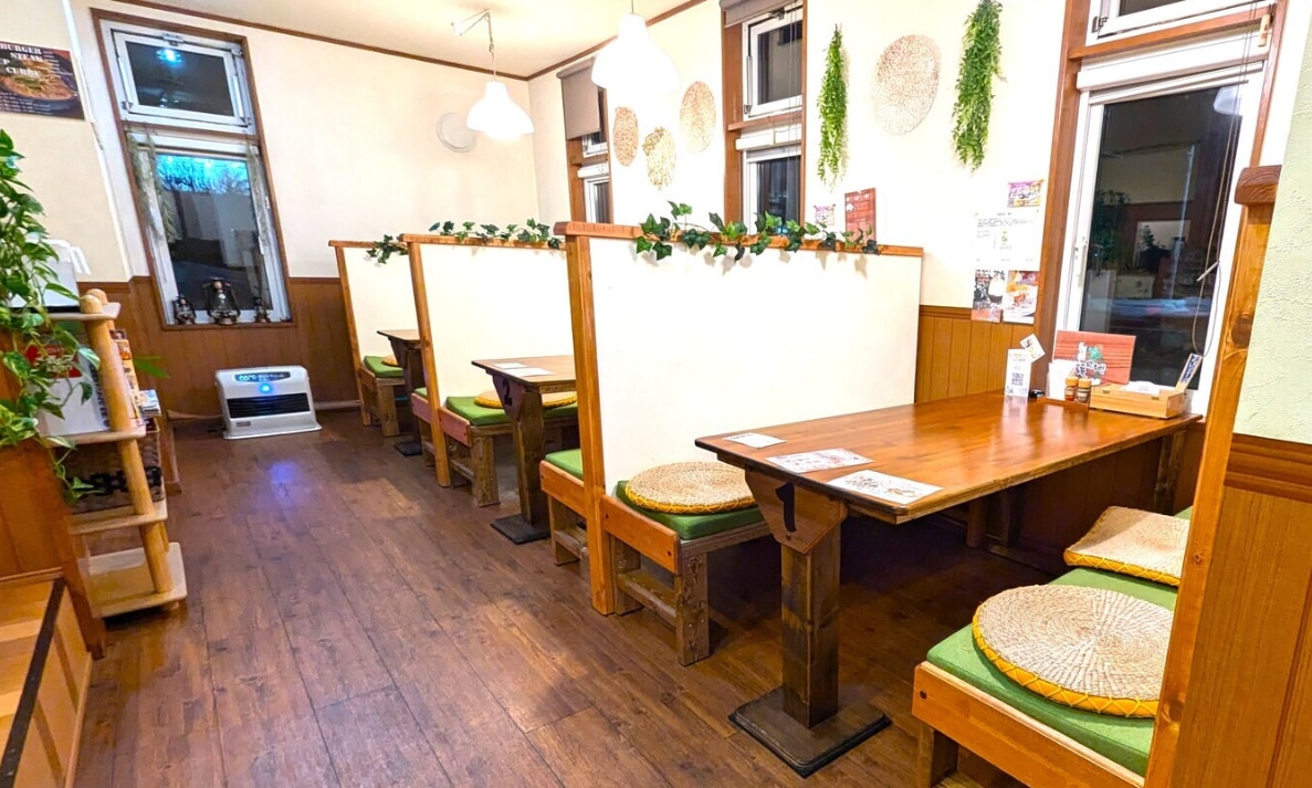 店内はカジュアルで居心地の良いカフェ風のつくり。カウンターやテーブルがあり一人客からグループまで対応可能、駐車場も用意されているため車での訪問がしやすいのも特長です。通し営業のため、朝食・ランチ・早めのディナー、カフェ利用まで幅広いシーンで使えます。
