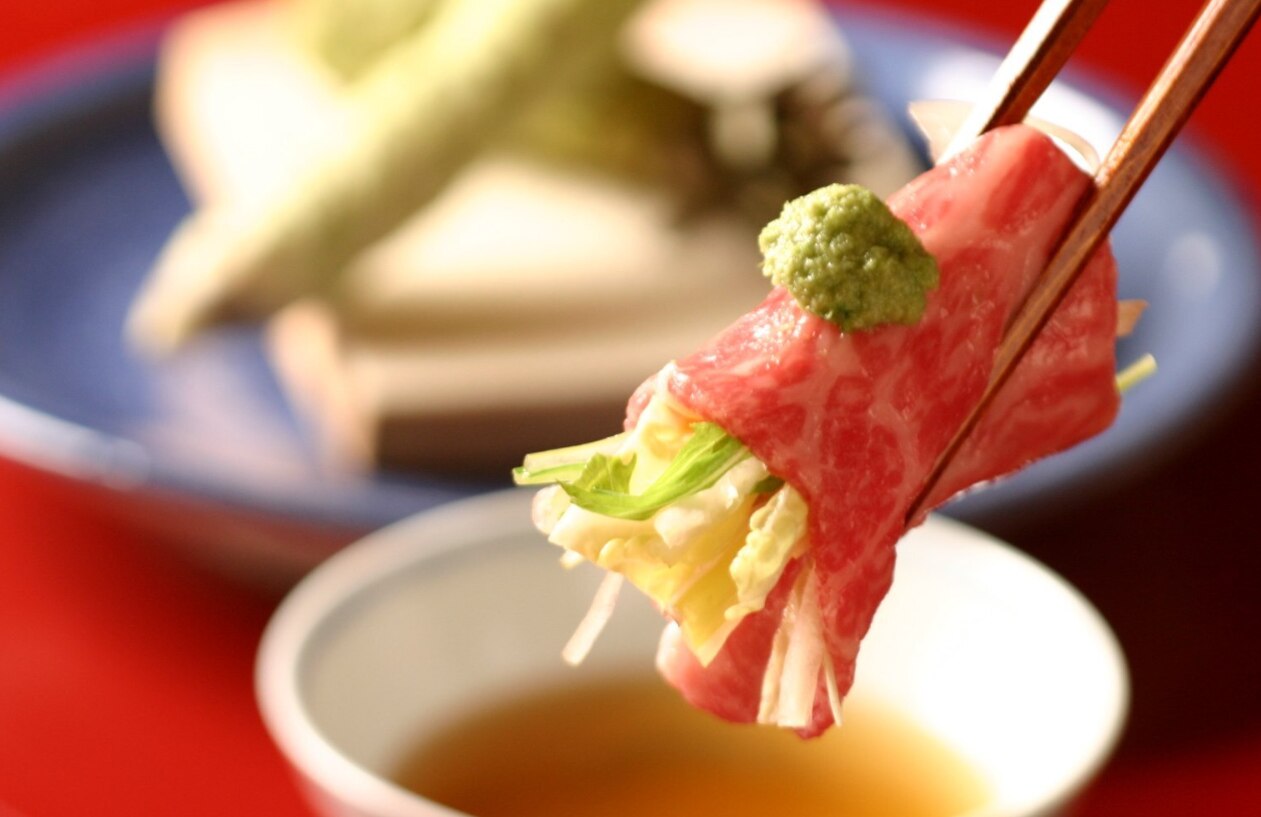 月亭の名物は、すき焼きとしゃぶしゃぶ。特に、極上の飛騨牛を使った120gのしゃぶしゃぶやすき焼きは人気です。しゃぶしゃぶは牛肉を軽く湯がき、刻み野菜を巻いて、自家製わさびだれで食べるスタイル。すき焼きは野菜盛りとうどん、あるいはご飯がついており、旨みを引き立たせた味わい。また、京懐石コースも提供しており、四季折々の旬食材を使った八寸料理なども楽しめます。