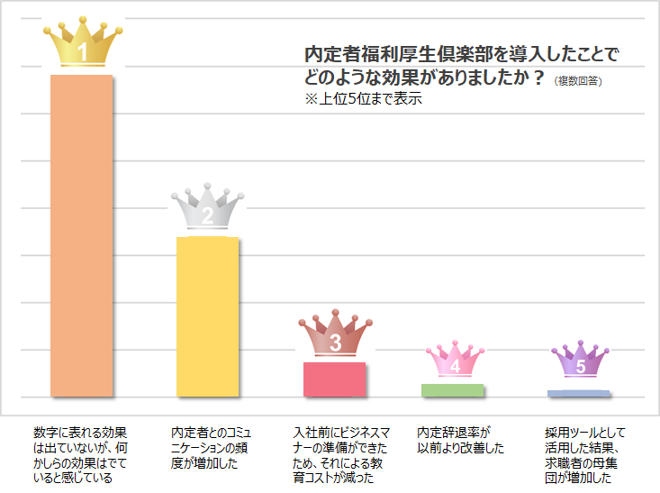 具体的な効果としては、『内定者福利厚生倶楽部』に無料付帯されているeラーニング“eフレッシャーズ”*2 や内定者とのチャットツールを活用することで、教育コストの削減や内定者とのコミュニケーション向上にもつながっていることがアンケート結果から読み取れます。