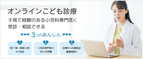 24時間365日医師につながる、オンライン診療・健康相談のサービスを受けることができます。診療においては、自宅への薬の配送やかかりつけ薬局での薬の受け取りなど希望に合わせた対応が可能です。これらのサービスは、保険適用、自治体の子ども医療費助成など、行政支援も受けることができます。