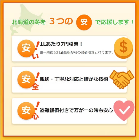 さらに、定期宅配をお選びいただくと、一般市況価格からマイナス7円/Lで給油できる上、会員の方の灯油ご利用サイクルに合わせて定期的に配送へ伺います。毎回の注文がいらず、灯油を切らす心配もないので安心してお任せいただけます。また、近年、ご家庭のタンクから灯油が盗まれる事件が多発しています。もし、定期配送をお申し込みの会員の方が盗難に遭っても、失われた灯油を補償します!*7