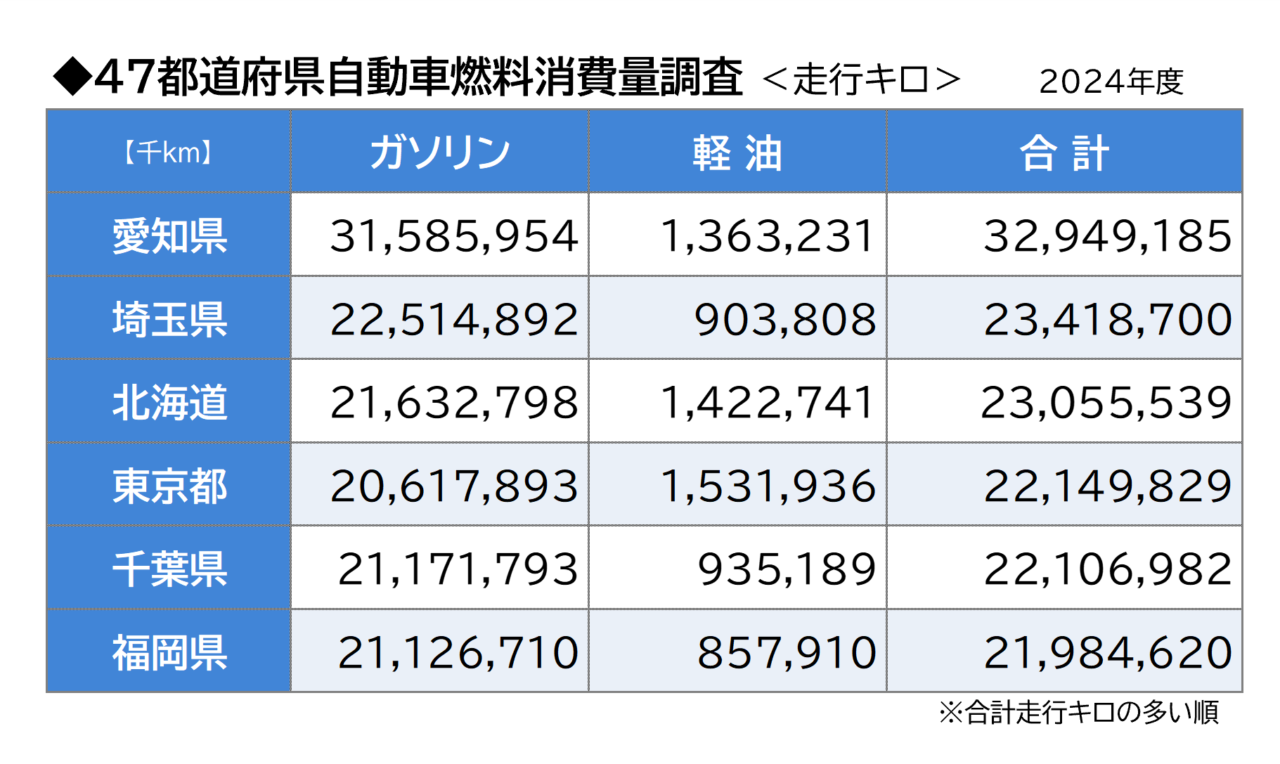 経済産業省による「自動車燃料消費量調査(2024年度)」*2 においても、乗用車(貨物車・バスなどの商業利用車を除く)の走行距離合計は、都道府県別で自動車大国である愛知県が1位、北海道は3位となっています。その他の上位地域を見ても大都市圏が中心であり、北海道は人口規模に比べて走行距離が長い傾向にあることがうかがえます。これは、自家用車での走行距離が全国平均よりも長いため、ガソリン消費量も相対的に高いことを示しています。