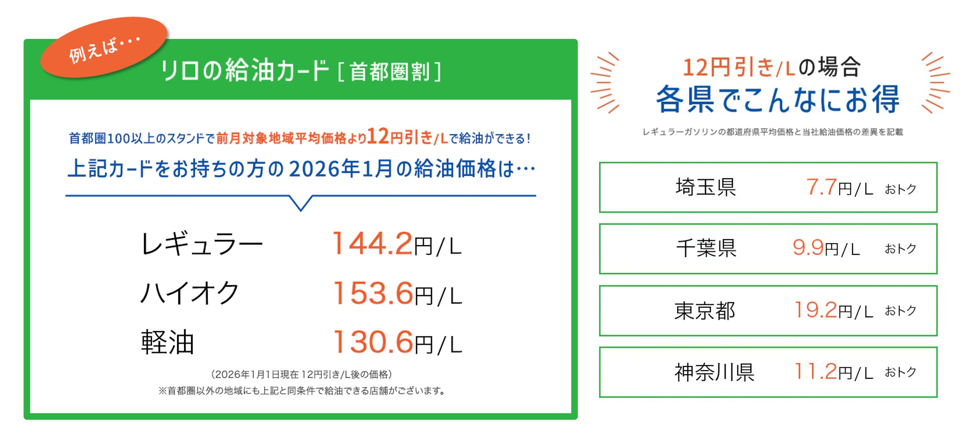 そのシリーズの中でも、地域を限定し提供する「リロの給油カード 地域割」は普段使いのガソリン(レギュラー、ハイオク、軽油)を、より安価に提供するサービスです。