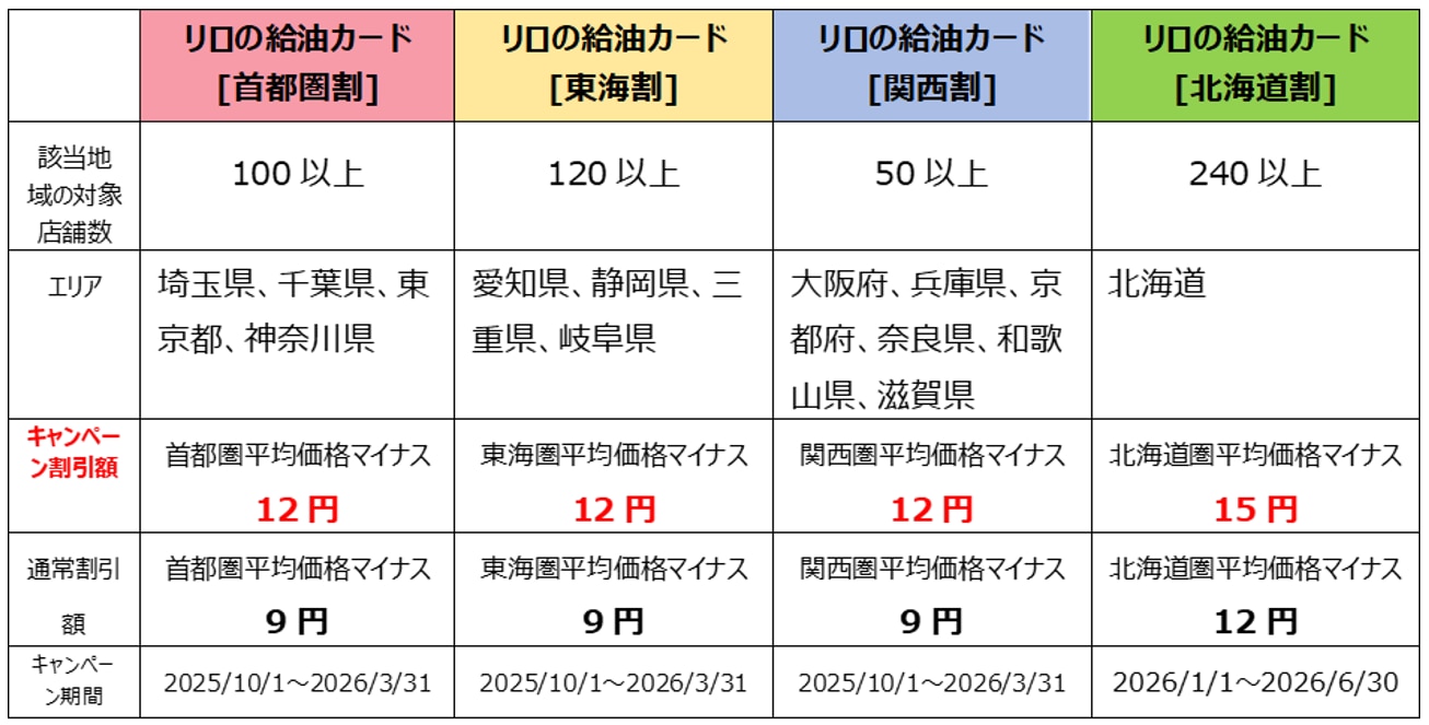 さらに、「リロの給油カード 地域割」新登場を記念し、対象地域平均価格マイナス12円~15円のBIGキャンペーンも実施しております*6
